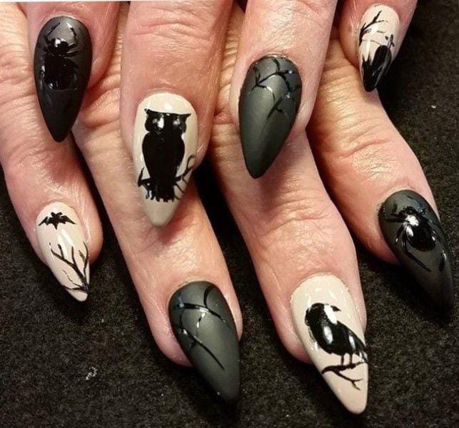 Matte black and nude nails featuring owls, crows, bats, and spiderwebs for a gothic, night-time feel.