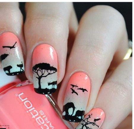 Bright coral-to-nude gradient nails with black silhouettes of trees, crow, and animals, resembling a sunset scene.