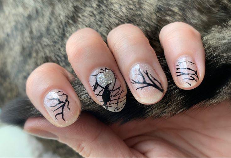 Sheer glittery nails with black tree branches and a lone crow sitting against a silver moon, creating a mystical, delicate look.