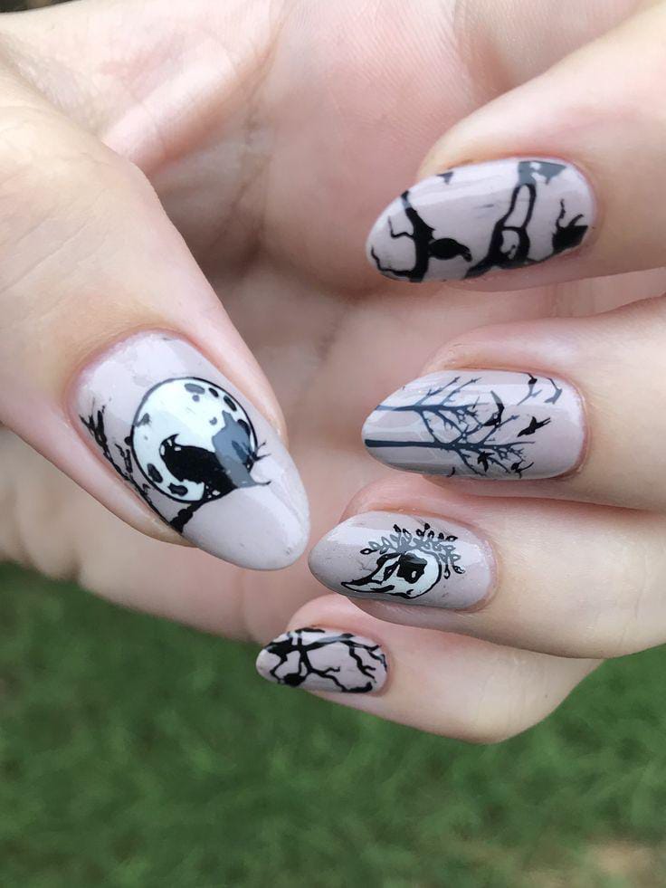 A muted nude base detailed with crows, tree branches, and a glowing moon for a dark, mystical feel.