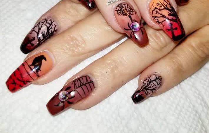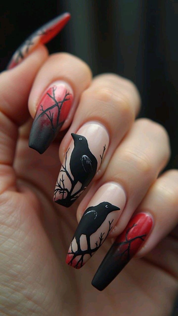 Long nails with a gradient red-and-black base, branches, and perched crows, creating a dark, dramatic mood.