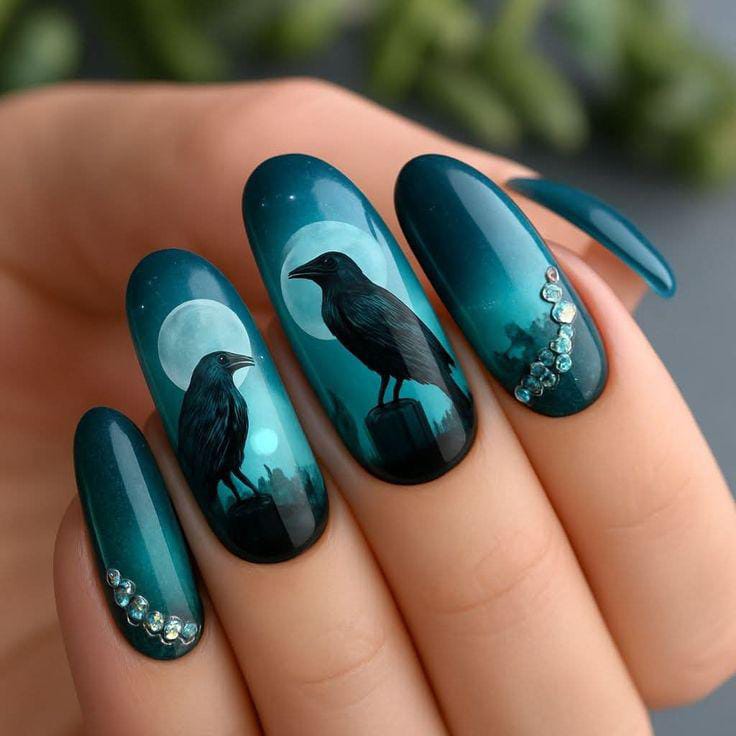Deep teal nails with moonlit crows and subtle gem accents, giving a mysterious, elegant night-sky vibe.