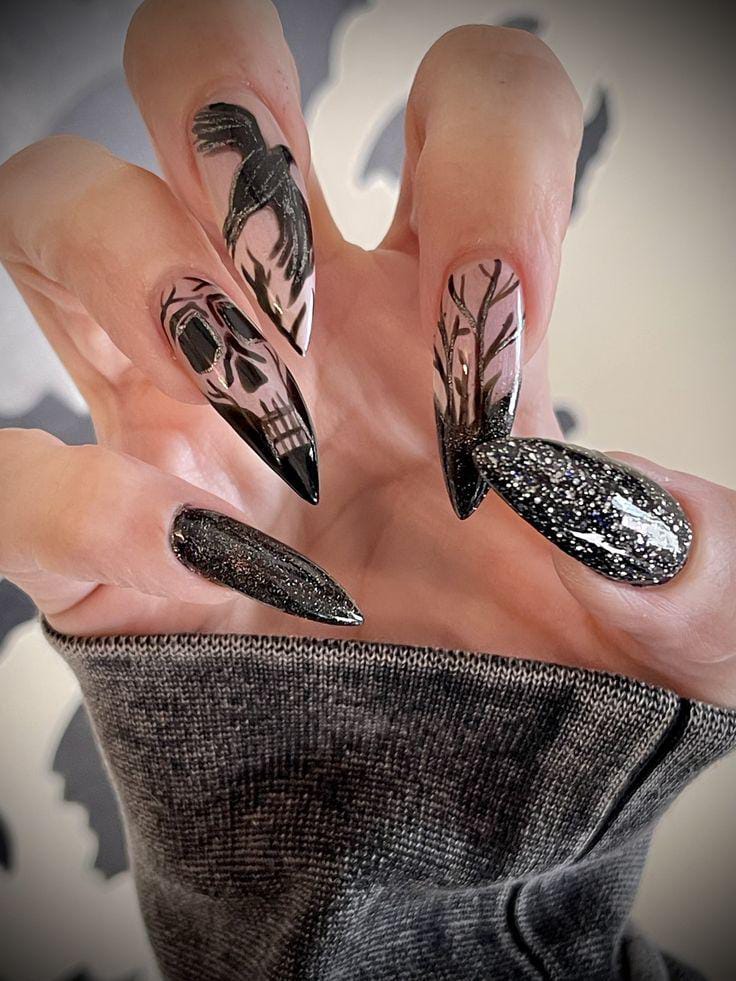Black and nude nails with glitter, trees, skulls, and flying crows, perfect for a dark, haunting aesthetic.