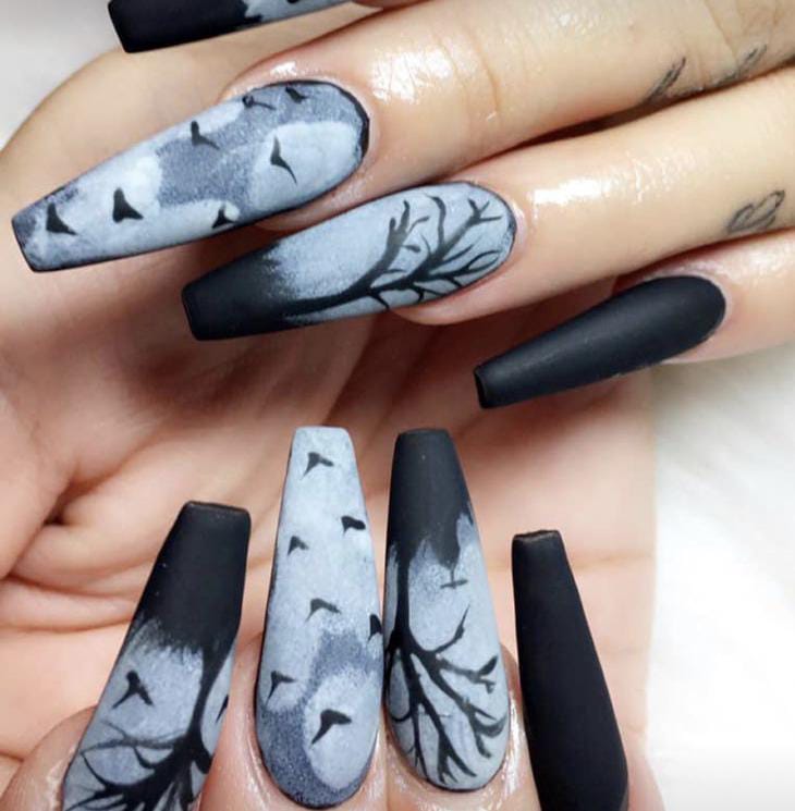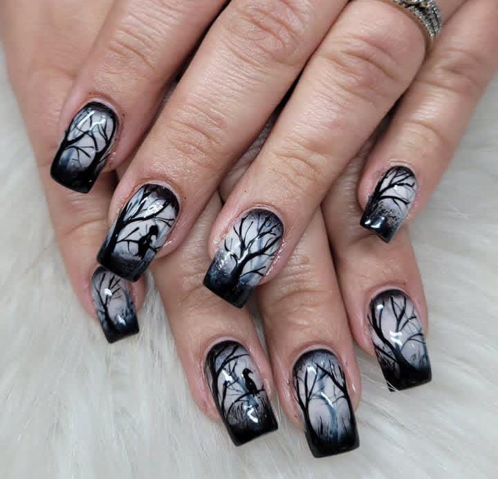 Black-and-gray gradient nails with eerie tree branches and perched crows, evoking a dark, enchanted night.