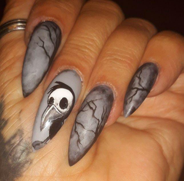 Smoky grey nails with black branches and a striking crow face detail, giving a dark, edgy feel.