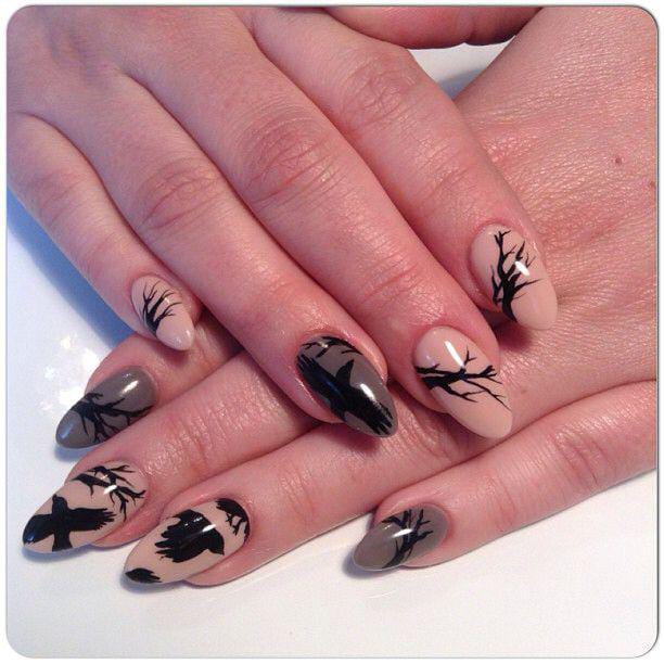 Soft nude nails with black tree silhouettes and flying crows, giving a moody woodland vibe.