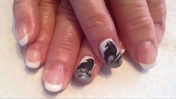 Classic French tips paired with simple crow silhouettes perched on branches, blending timeless style with a gothic twist.