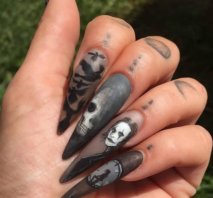 Dramatic matte black nails featuring skulls, crows, and the Eric Draven from “The Crow”, perfect for a bold and movie statement look.