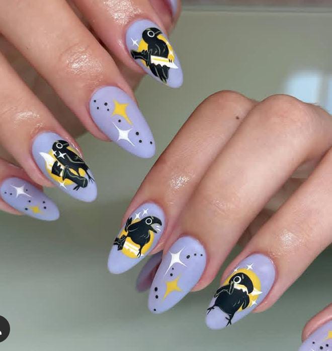 Lilac nails decorated with cartoonish black crows holding knives, stars, and moons for a fun yet mystical look.