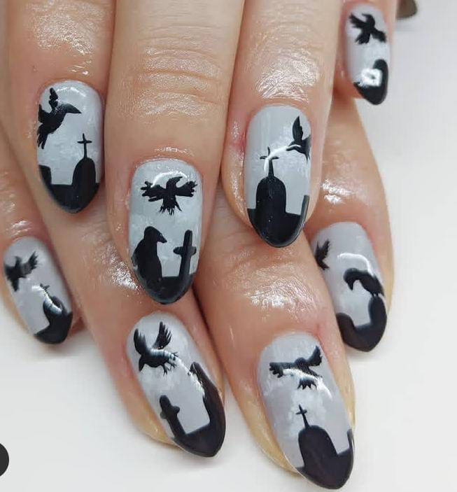 Grey nails with dark cemetery silhouettes and crows in flight, creating a gothic, haunting style.
