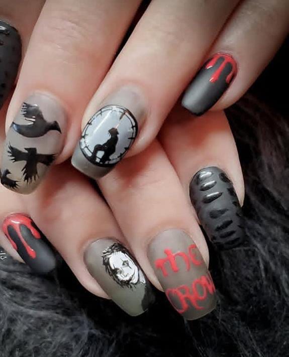 Matte nails featuring crows, barbed wire, blood drips, and “The Crow” lettering, and Eric Draven inspired by the movie.