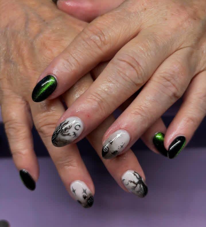 A mix of shimmering green and neutral nails with spooky trees, moons, and flying crow for a magical nighttime feel.