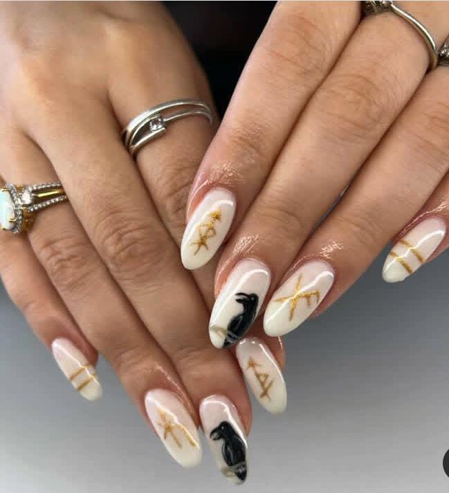 Soft nude nails with delicate golden accents and black crow details, creating a chic yet mysterious vibe.