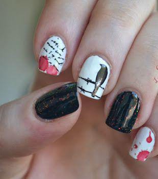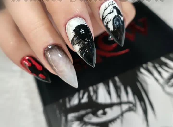 A mix of black and white nails with crow silhouettes, barbed wire, and splashes of red for a dark, edgy vibe.