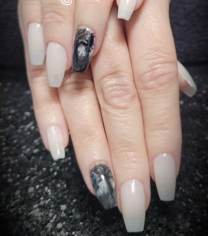 Sharp black-and-white nails with bold crow art, graveyard and a smokey accent nail giving an intense gothic edge.