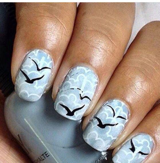 Light gray-blue nails with fluffy cloud patterns and black crows, evoking a dreamy sky atmosphere.