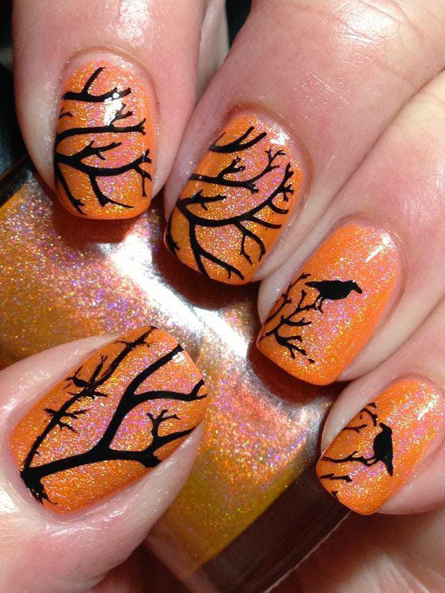 Bright orange shimmer nails with black branches and perched crows, giving a bold autumn or Halloween look.