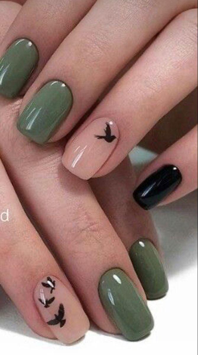 Earthy green and nude tones accented with black bird silhouettes for a modern, minimalist style.
