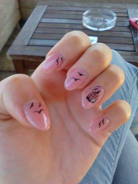 Soft pink nails with flying crows and an open cage design, symbolizing freedom and light elegance.