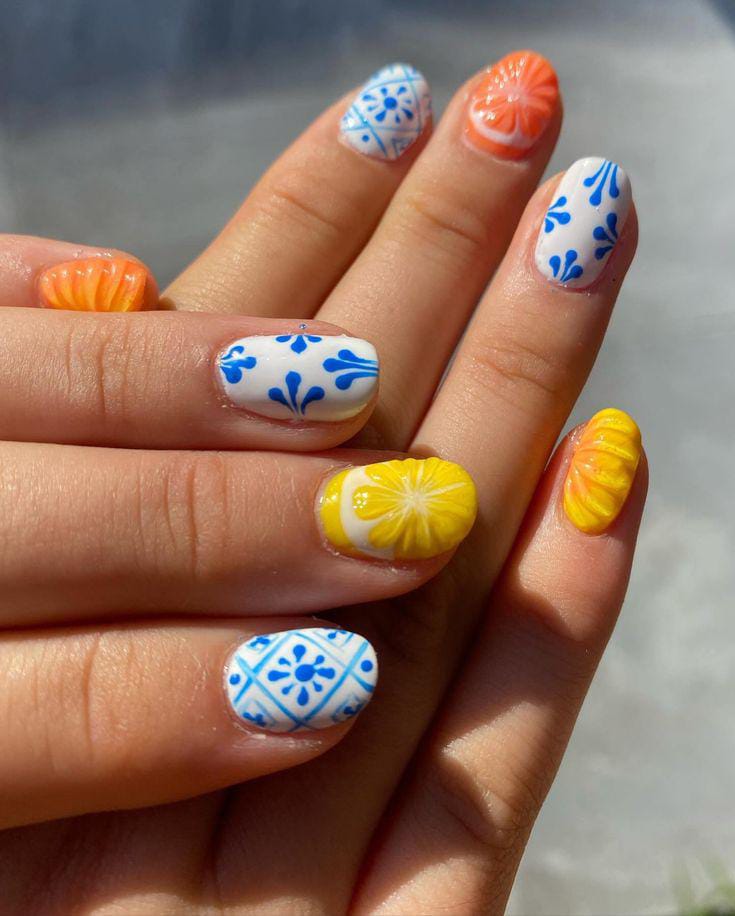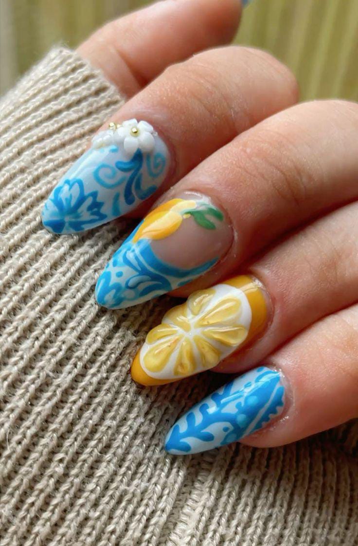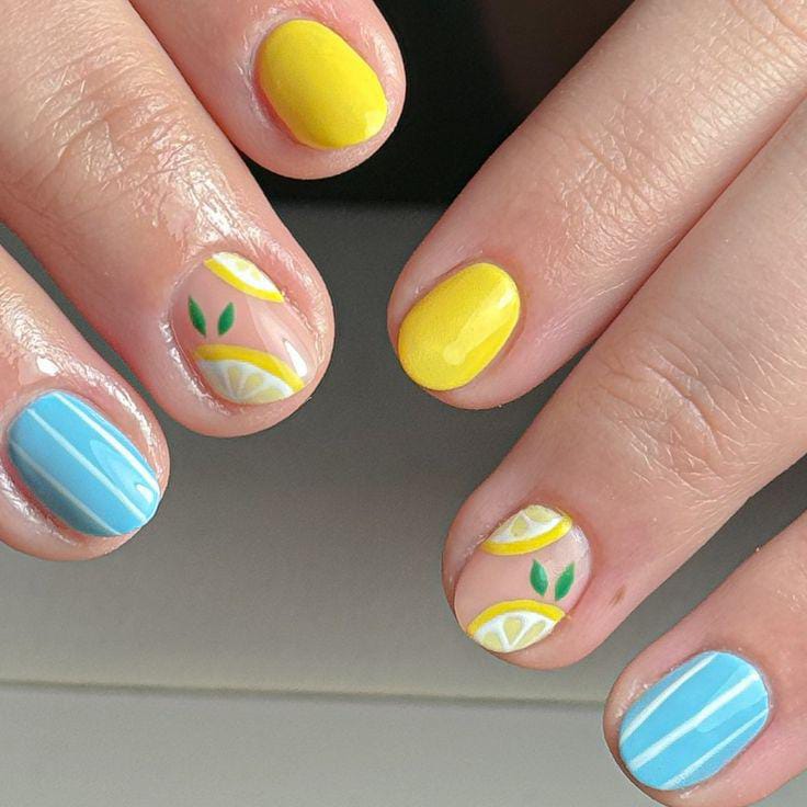 Bright yellow and pastel blue nails are combined with playful citrus-inspired accents. This look is cheerful, fun, and full of summer energy.