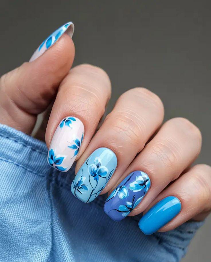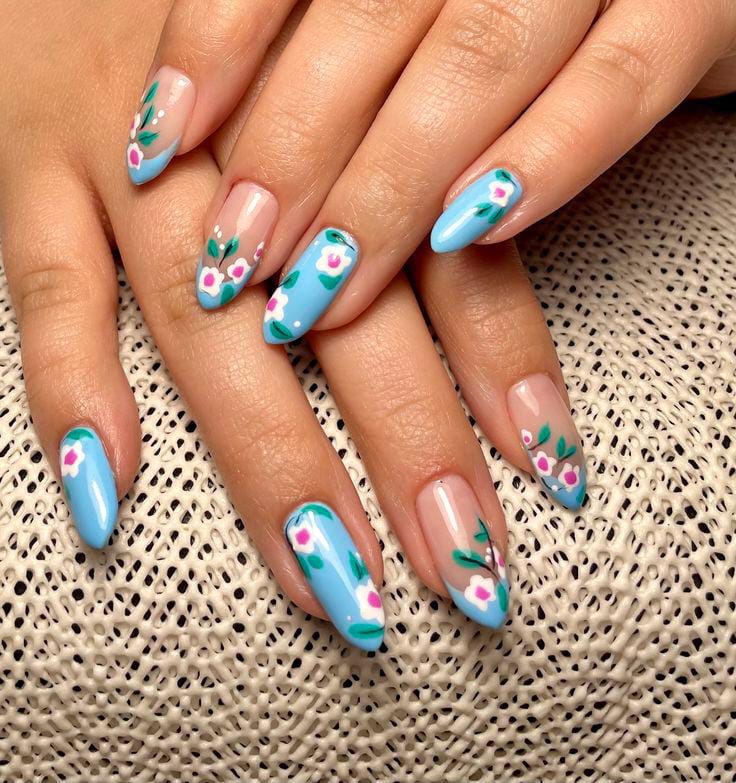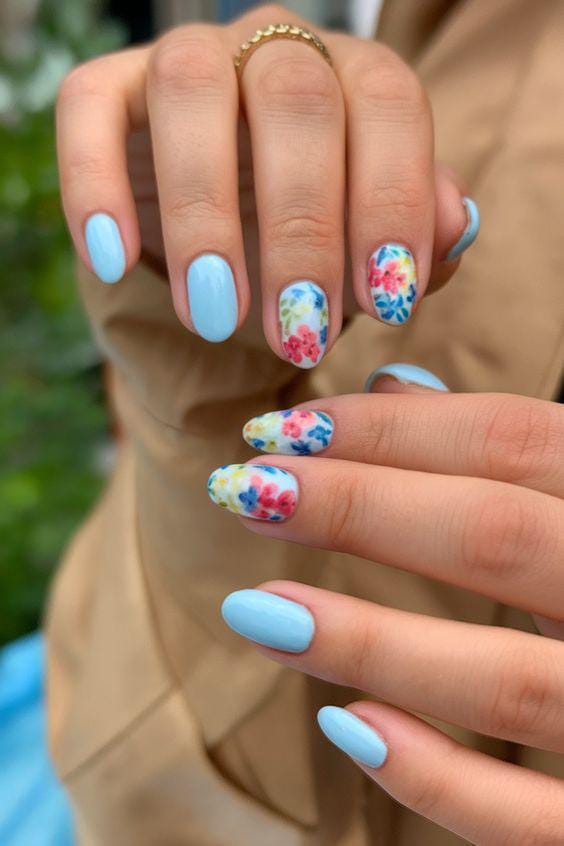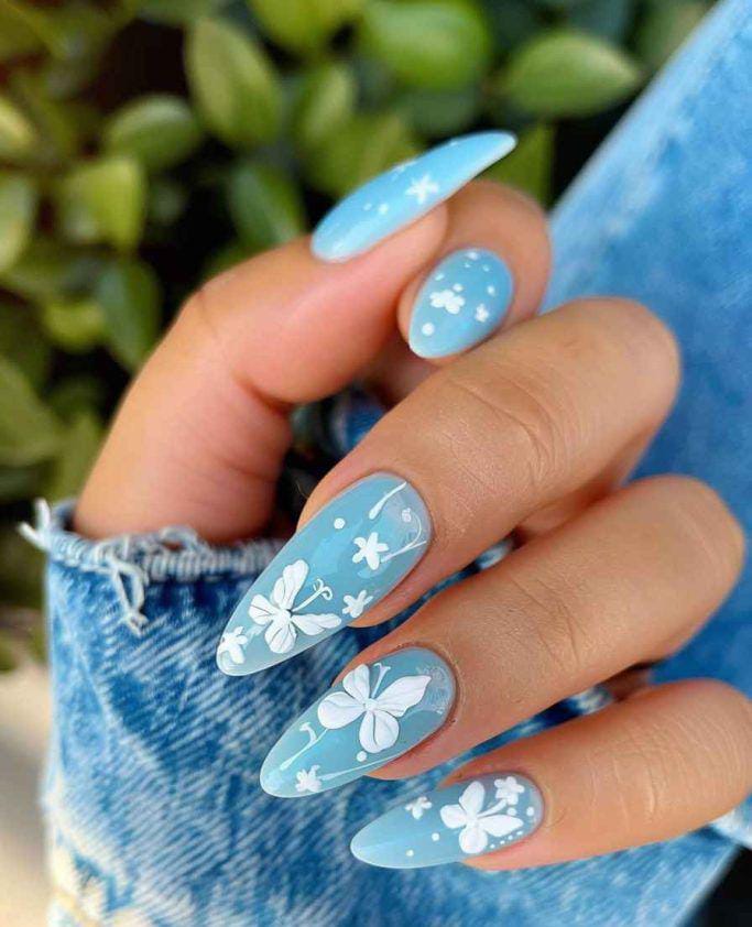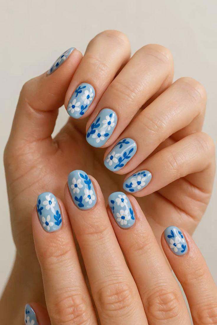 A fresh, light blue base with white and blue flowers scattered across the nails, giving off a soft, feminine vibe perfect for summer.