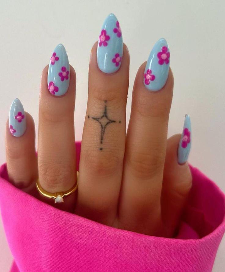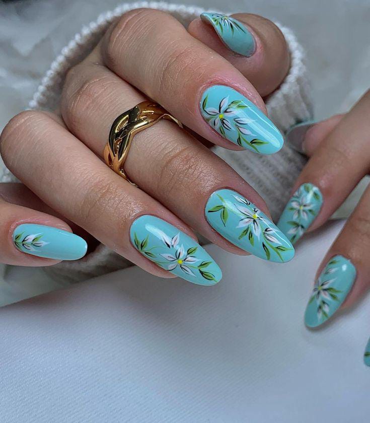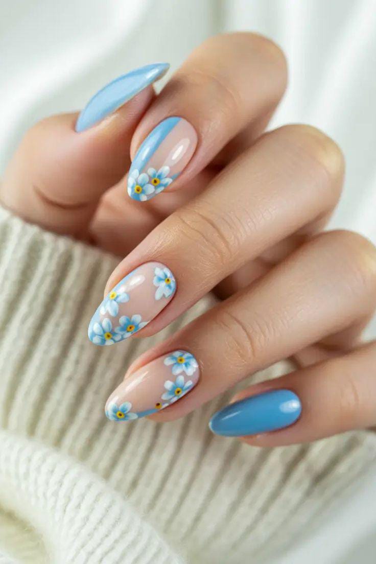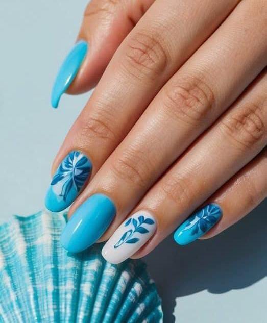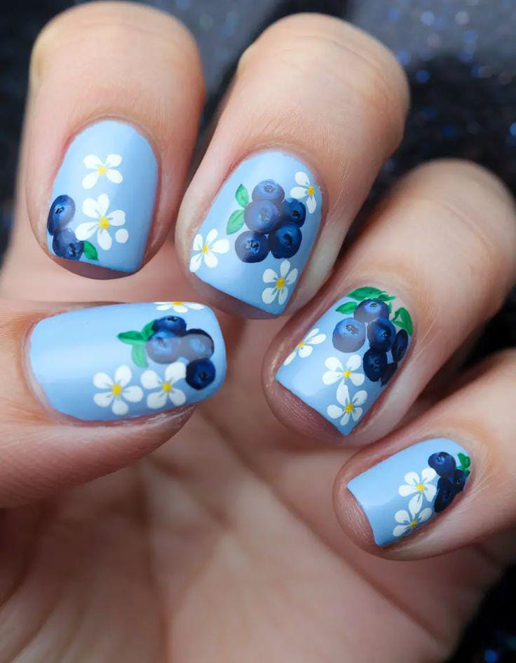 A fresh, light blue base with white and blue flowers scattered across the nails, giving off a soft, feminine vibe perfect for summer.