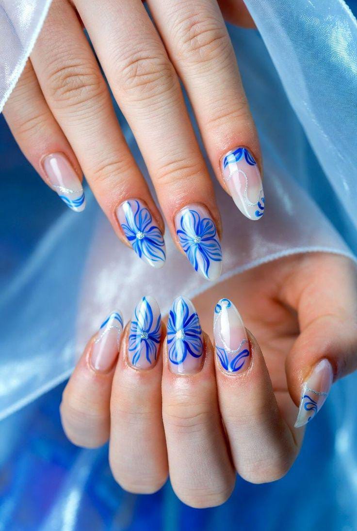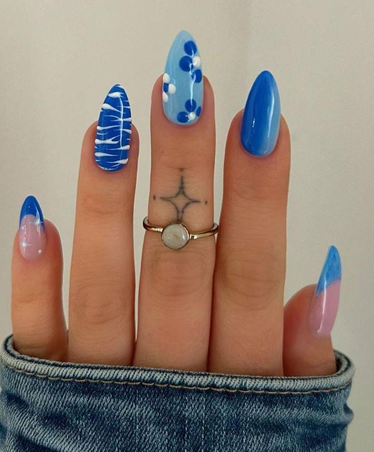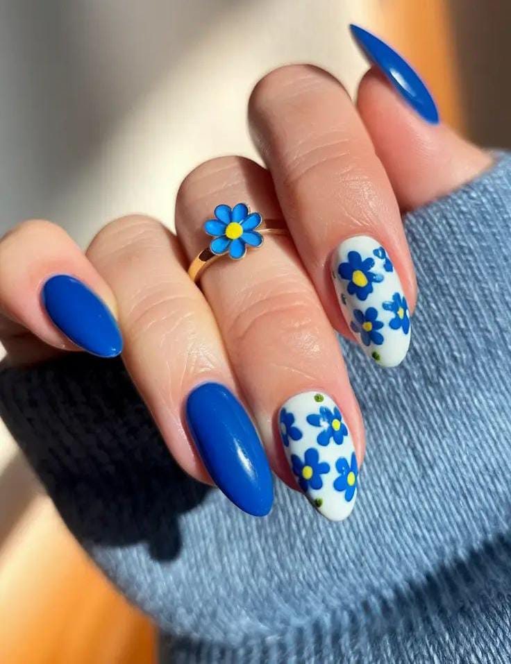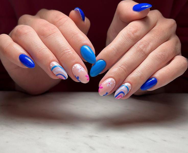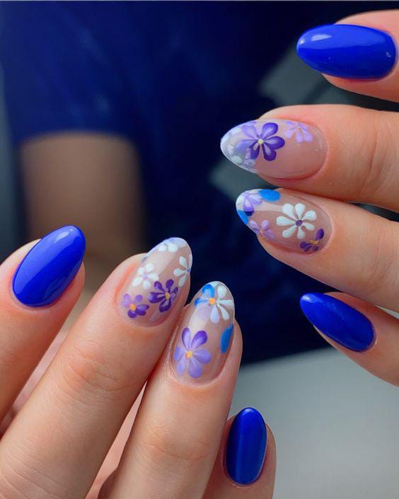 Bold cobalt blue nails are balanced with sheer bases and floral designs. The contrast gives it a chic yet playful summer feel.