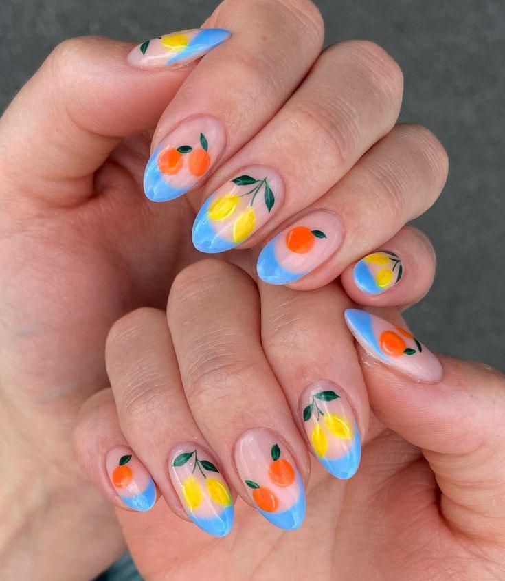 Sheer nude nails fade into soft blue tips, finished with hand-painted lemons and oranges green leaves. The look is cheerful, fruity, and full of bright summer energy.
