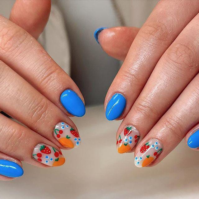 Vibrant blue nails are mixed with nude bases featuring strawberries, dots, and colorful fruit accents. The overall vibe is fun, youthful, and perfect for a cute summer statement.