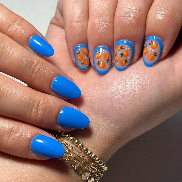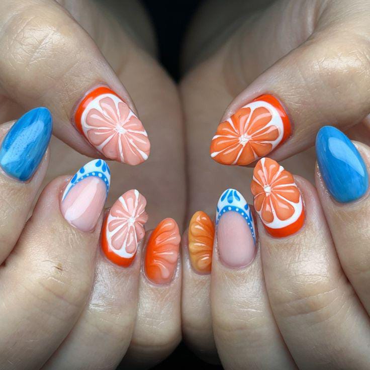 Bright blue, orange and nude tip nails mix with playful citrus slice art for a fresh, juicy summer look. The glossy finish and bold colors give these nails a fun, vacation-ready vibe.