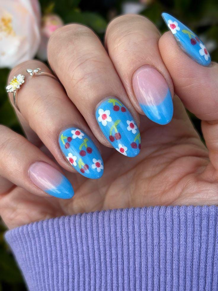 Soft blue and nude tip nails paired with tiny cherry and floral details create a sweet, retro summer feel. The mix of solid and detailed nails keeps the look light, cheerful, and wearable.
