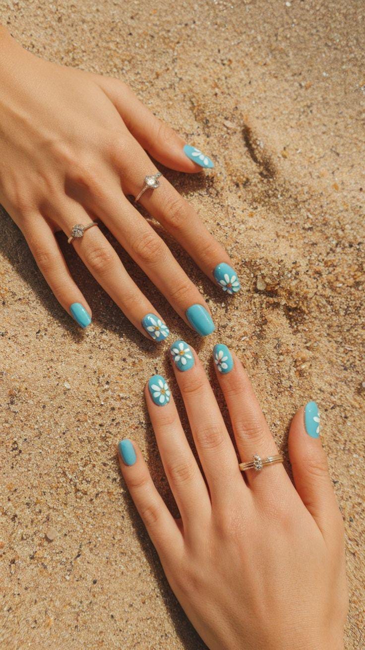 Solid sky-blue nails paired with simple white daisies feel light and carefree. The look is minimal, sunny, and perfect for warm beach summer days.