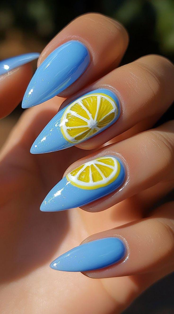 Cool sky-blue stiletto nails with bright lemon slice accents give off a crisp, refreshing summer vibe. The clean design and glossy finish make it feel bold yet effortlessly cute.
