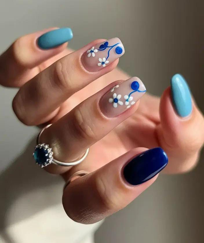 A smooth dark and light blues nail with soft white accent, intricate blue floral detailing, creating a serene and artistic summer nail look.