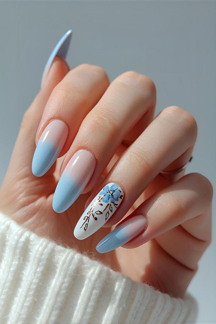 Light blue ombré nails are paired with a subtle floral white accent for a clean, airy look. It feels calm, feminine, and perfect for warm sunny summer days.
