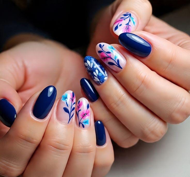 Deep navy nails are balanced with hand-painted floral designs in soft blue and pink shades on nude base. The contrast gives it a bold yet artistic summer feel.