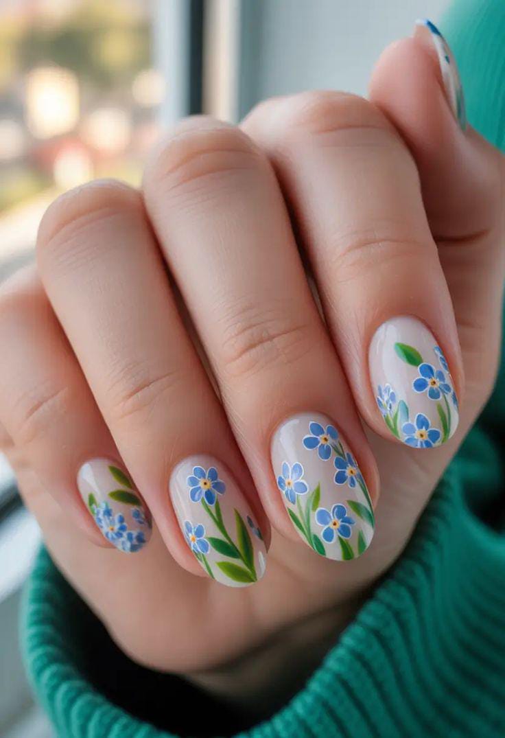 Tiny blue flowers and green leaves over a sheer nude base create a delicate, romantic style. The soft brushwork and natural summer tones feel airy and elegant.