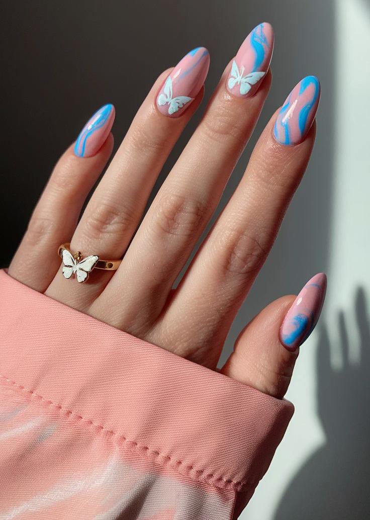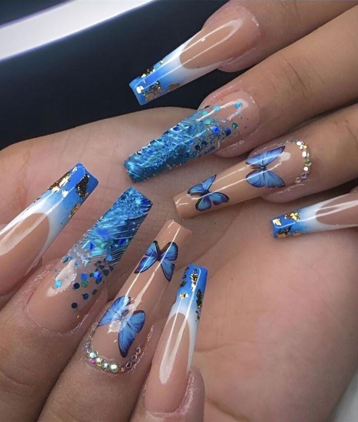 These long nude nails are accented with bold blue ombre tips, butterfly art, and a touch of gold foil subtle blue glitter nails for extra drama, delicate rhinestones. The mix of nude and deep blue gives it a trendy, statement-making summer feel