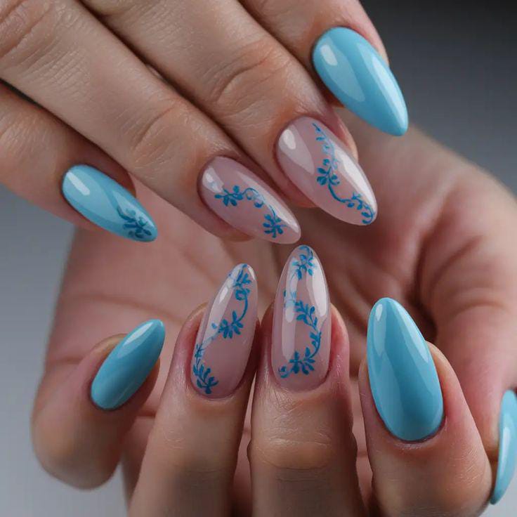 Pastel blue and nude nails feature delicate leafy patterns-like branches that add a gentle decorative touch. The look is soft, feminine, and refreshingly subtle summer aesthetic.