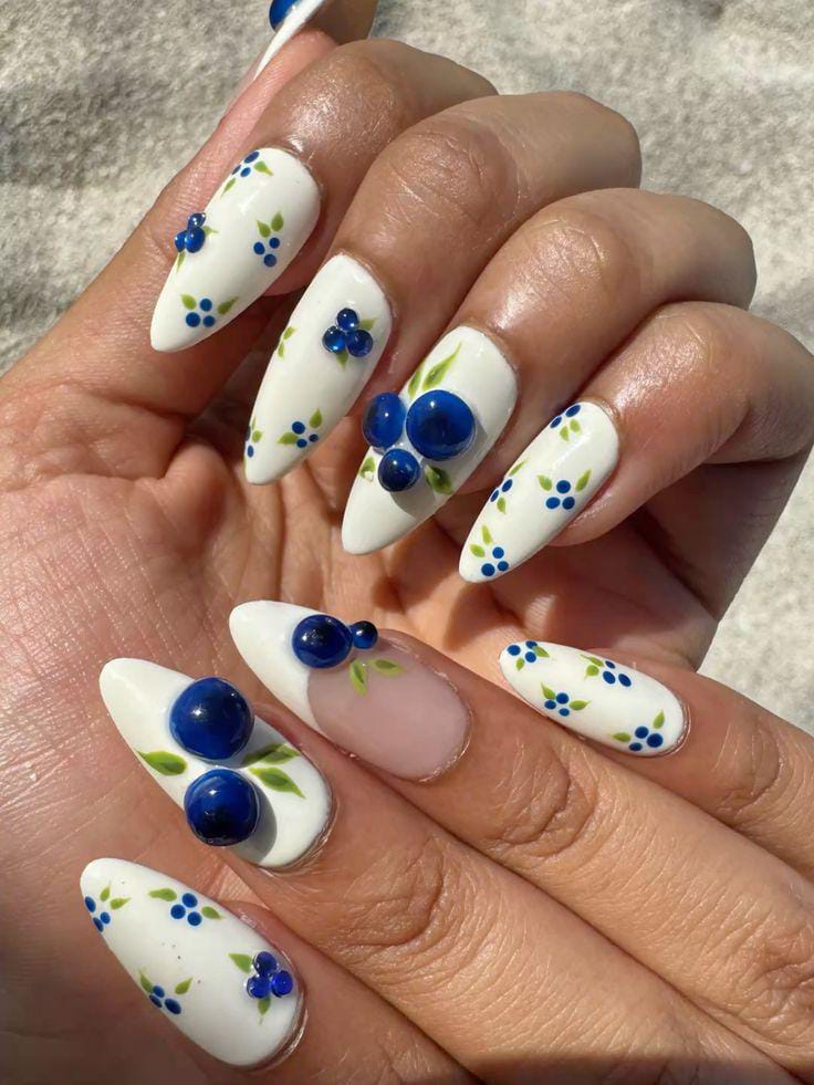 Creamy white tip nails are decorated with tiny blue berry, green leaf details and raised accents for a playful twist. This design feels fun, artistic, and charmingly summery.