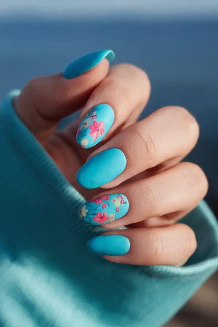 Bright blue nails are balanced with a single floral accent on a neutral base. The design feels minimal, polished, and effortlessly cute for everyday summer wear.