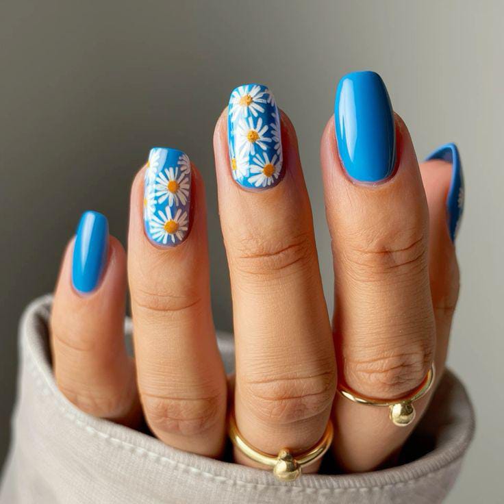Featuring vibrant blue daisies against a white and blue nails, this design exudes a cheerful and bold summery energy.
