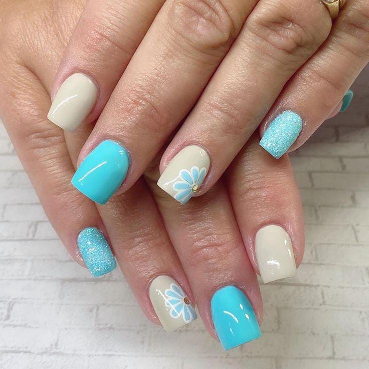 A mix of light blue, nude nails with a blue daisy design and sparkly accents. This design offers a chic and breezy summer look.