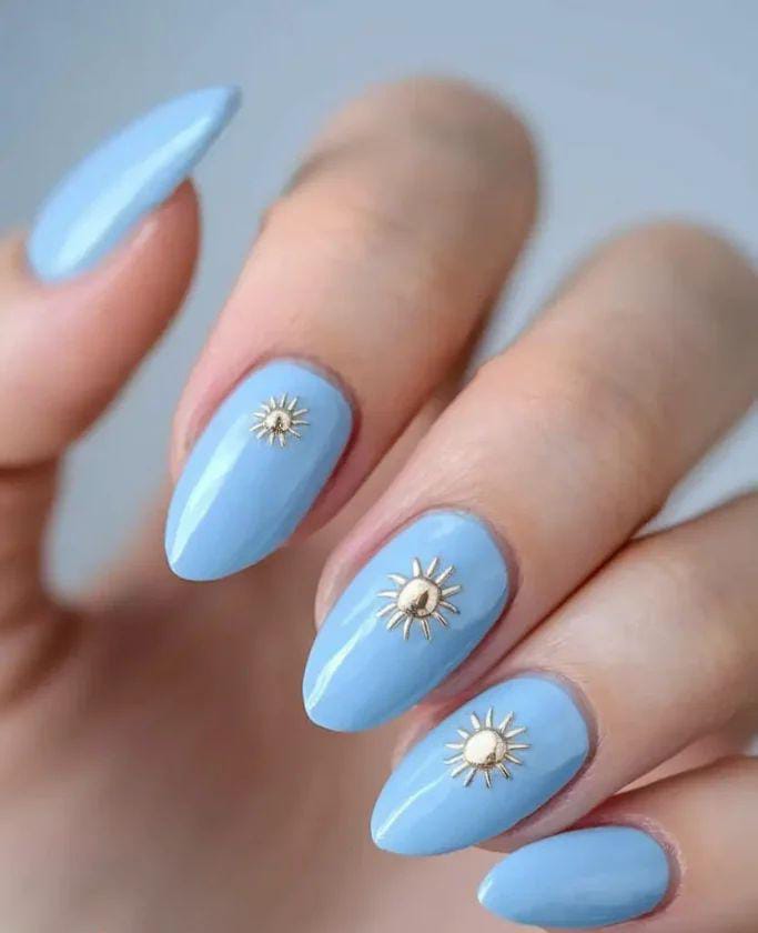 A serene sky-blue nail design featuring small golden sun charms, creating a warm, sunny summer aesthetic. The minimalistic sun details give a modern, bright touch.