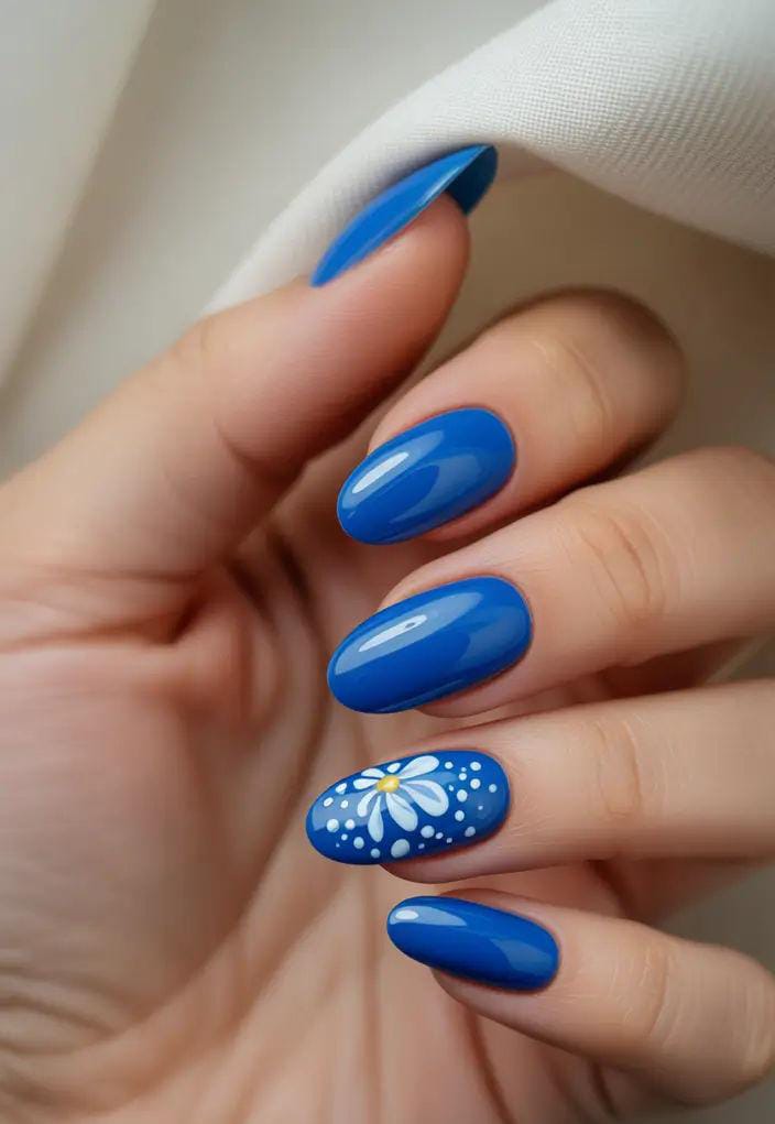 Deep blue nails with a bold white daisy and dots on one accent nail. This design is simple yet elegant, perfect for a sophisticated summer look with a floral twist.