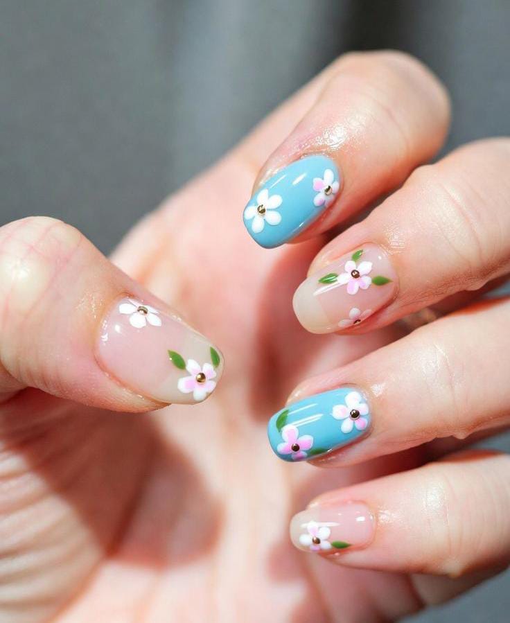 Alternating pastel blue and nude nails with small floral details subtle studs feel sweet and modern. The soft colors and simple flowers keep the look fresh and youthful summer.