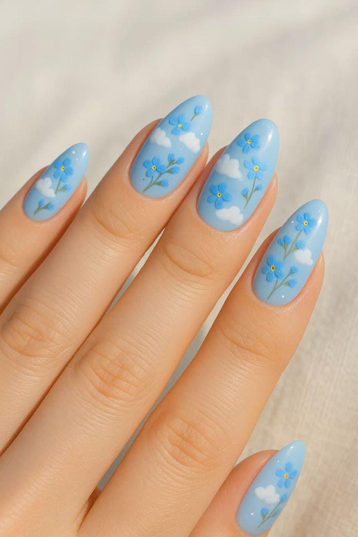 Soft baby-blue nails feature tiny hand-painted flowers and fluffy white clouds for a dreamy, sky-inspired look. The overall vibe feels light, calm, and perfectly summery.