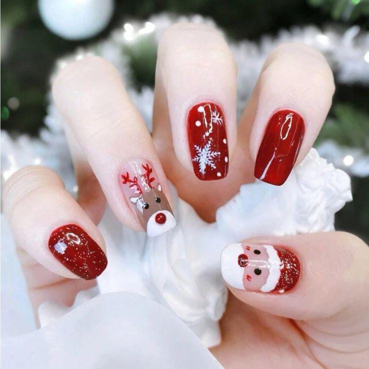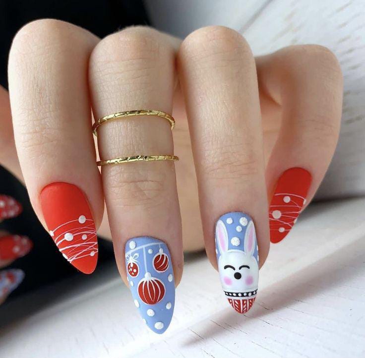 A fun twist on holiday nails with red and powder blue shades featuring ornaments, dots, and a smiling bunny — cheerful, playful, and full of Christmas festive charm.