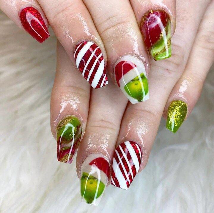 A bold and glittery look with red, green, and white tones, featuring The Grinch and candy-cane stripes accented by rhinestones for a sassy, fun Christmas vibe.