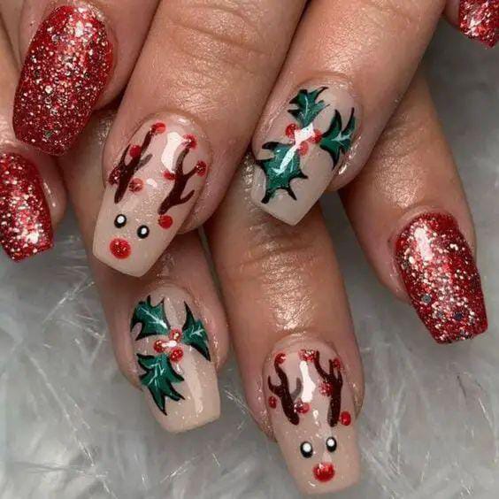 This playful design features nude nails with adorable reindeer faces, green holly leaves, and pops of red glitter on accent nails, giving off a cute and festive Christmas vibe.